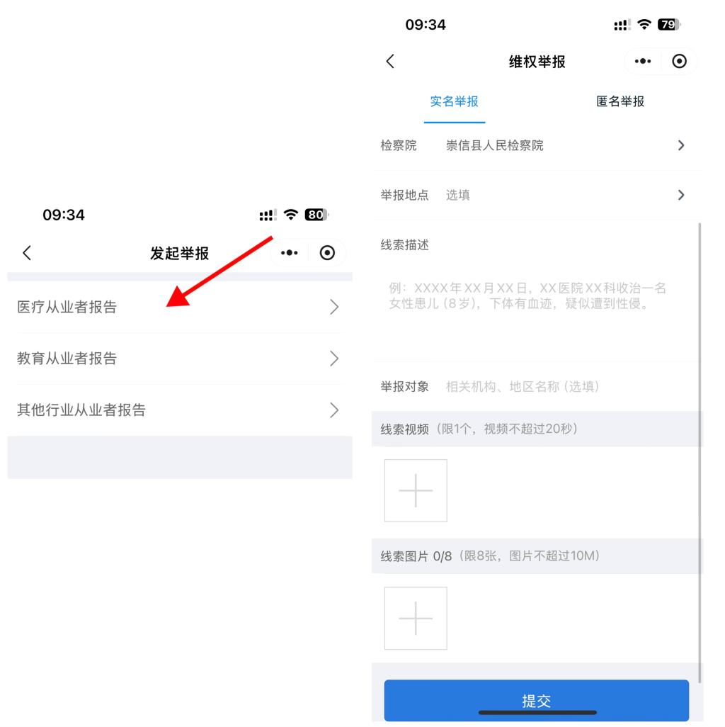 (1)首先进入维权举报首页,进入“强制报告主体”模块,点击下方发起举报,点击“医疗从业者报告”,进入详情页。(2)在强制报告专项详情页,可以选择实名举报或者匿名举报。