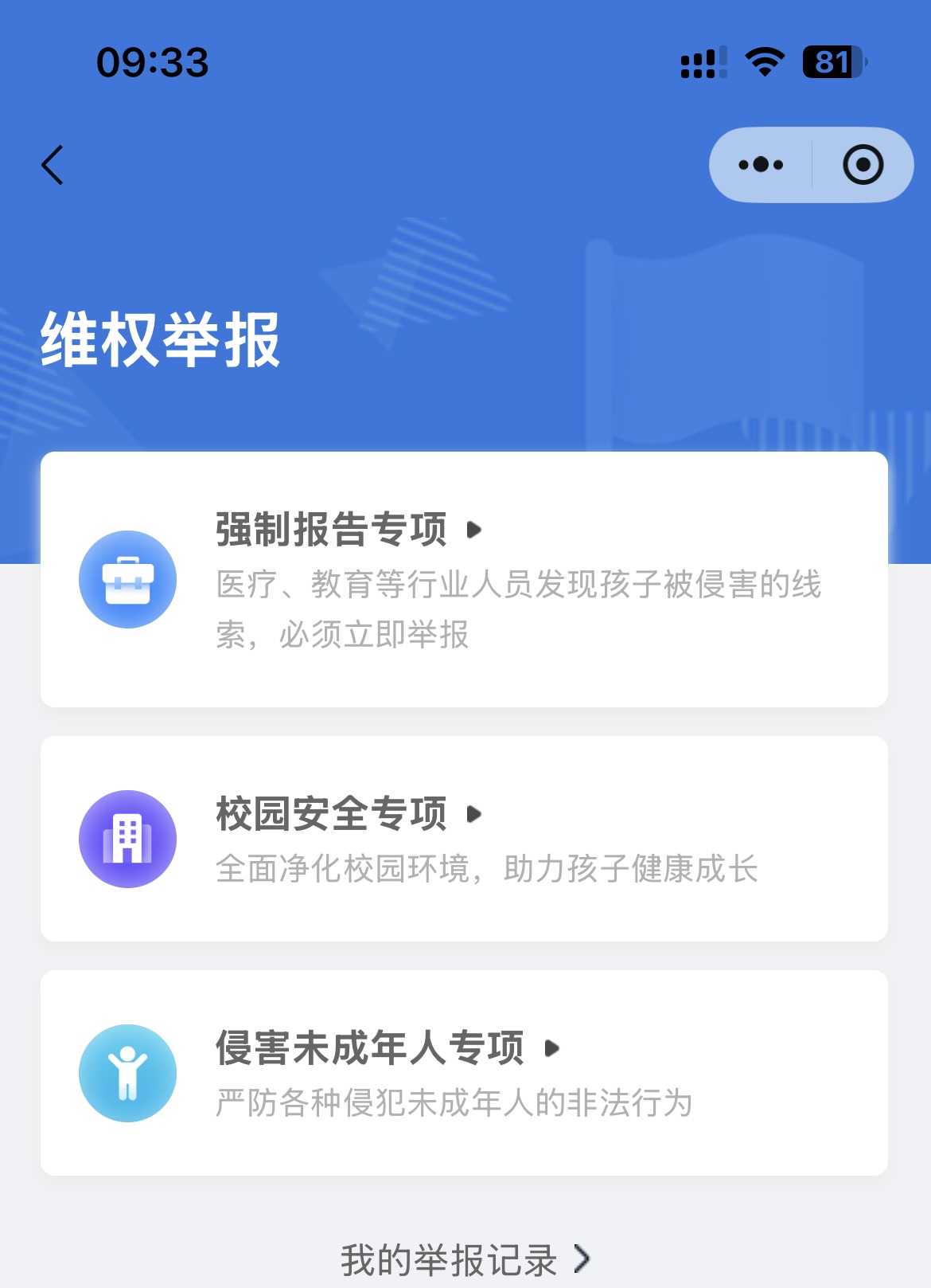 在维权举报模块,主要分为三个专项:强制报告专项、侵害未成年人专项、校园安全专项。每个专项下面细分为具体的专项内容。需要维护时,可以通过点击对应的入口,填写相应信息,我们将及时研究处理。